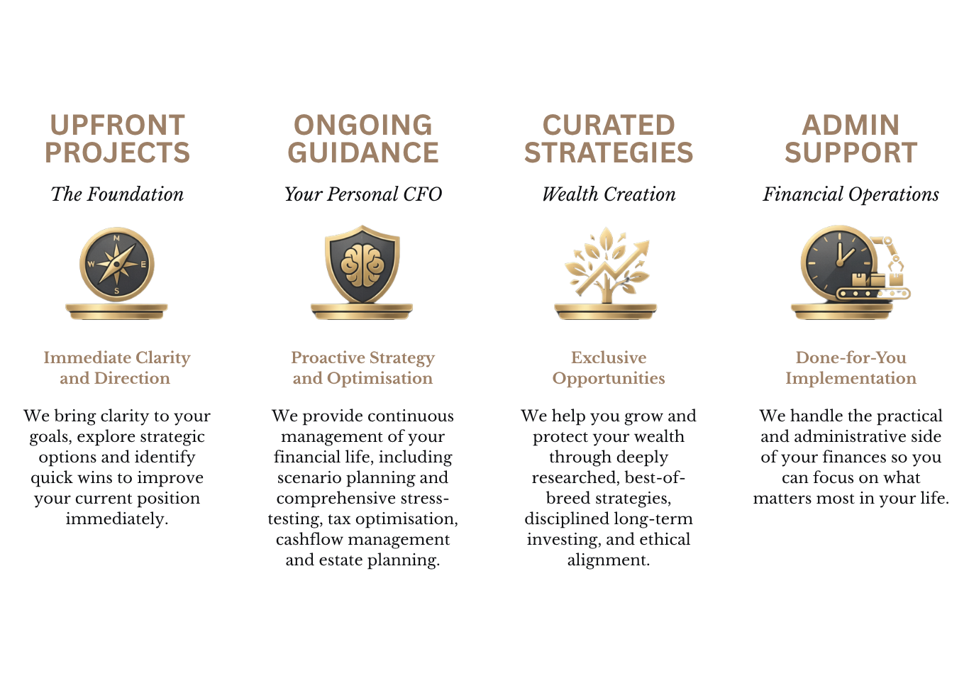 It’s about aligning tax, structure, cashflow, risk, and legacy planning so every part of your financial life works together. We engage the right professionals to deliver a cohesive, high-impact plan that works across your whole life.